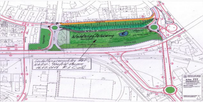 Statt des von der Stadt Krefeld geplanten kleinen Gewerbegebietes in dem grün ausgemalten bisherigen Gartengelände plädierten wir für eine kleine Waldanpflanzung und Beibehaltung des vorhandenen Naturteiches.