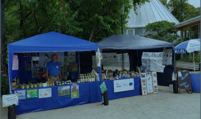 Am Infostand wird umfangreiches Infomaterial und NABU Artikel wie z.B. Nisthilfen für Vögel, Wildbienenhotels, Fledermauskästen und weitere Artikel verkauft.