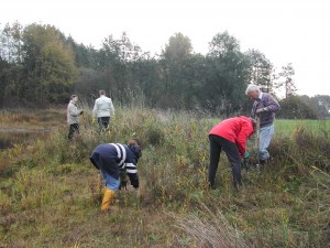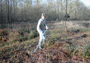 Viele schutzwürdige, offene Flächen (Heiden, Niedermoore und Gewässer für den Artenschutz) drohen durch starkes Wachstum von Brombeeren und Baumsämlingen zuzuwachsen. Dadurch wird die konkurrenzschwache, ursprüngliche Vegetation unterdrückt. Wir schaffen den schutzwürdigen Pflanzen Überlebenschancen, indem wir in Handarbeit Brombeeren und Baumsämlinge entfernen. Das ist sehr mühselig, kostet viel Schweiß und nach drei Stunden Arbeit spüren wir unseren Rücken.