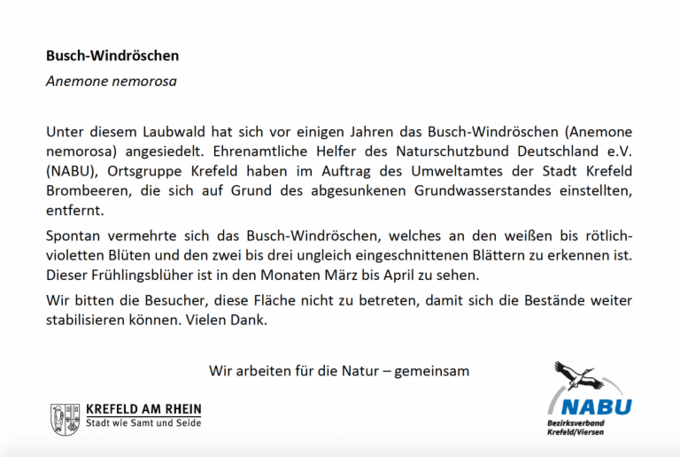 Jedes Jahr im März/April verwandelt sich die Buschwindröschenfläche in ein grün-weißes Blütenmeer. Das an der Ecke Rohrammerdyk/Hölschendyk im Hülser Bruch gelegene städtische Areal wird seit über 20 Jahren von der NABU-Gruppe Krefeld gepflegt. Regelmäßig werden Brombeeren und Baumschößlinge entfernt, die die flächendeckende Ausbreitung der Buschwindröschen bedrängen würden. Um auf die Arbeit der NABU-Mitglieder hinzuweisen und Besucher vom Betreten der Fläche abzuhalten, wurde am 3. April 2017 ein Informationsschild aufgestellt.