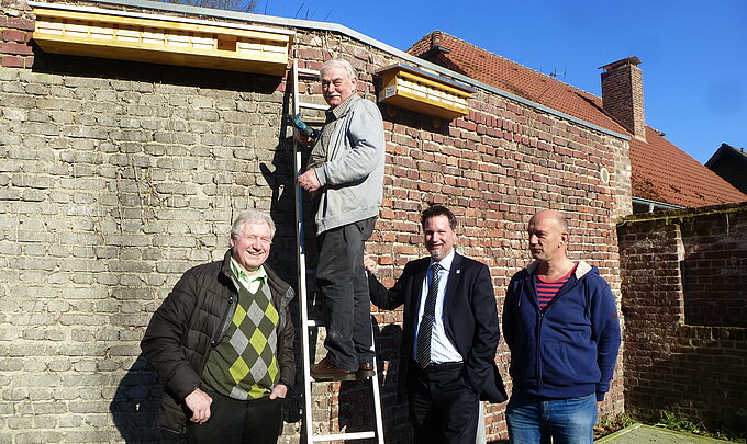 Neues Hotel im Schlosspark: Der NABU Willich hat der Stadt zwei „Spatzenhotels“ geschenkt, die jetzt im Park überreicht und sofort an die Garagen-Wand in der Nähe des Schlosspark-Eingangs montiert wurden.