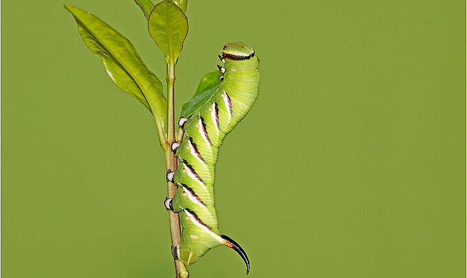 Auf dem NABU-Naturschutzhof kann man die Raupen in ihren Entwicklungsstadien beobachten. Die anfänglich geschlüpften Raupen von einer Größe von wenigen Millimetern werden bis zu 100 Millimeter lang. Durch ihre intensiven Farben und das große Analhorn ist es eine imposante Raupe, die man trotz ihrer Größe nur sehr selten zu Gesicht bekommt.