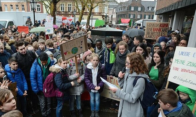 „Wir sind hier, wir sind laut, weil Ihr uns die Zukunft klaut”, schallte es am Freitagmorgen über den Buttermarkt. Viele Schüler und Erwachsene hatten sich vor Kempens Rathaus versammelt, um für den weltweiten Klimaschutz zu demonstrieren. Die Initiatoren Silke Diedrich und Georg Lüdecke waren ganz begeistert, welch großen Zulauf ihre Einladung zur Kundgebung gefunden hatte.