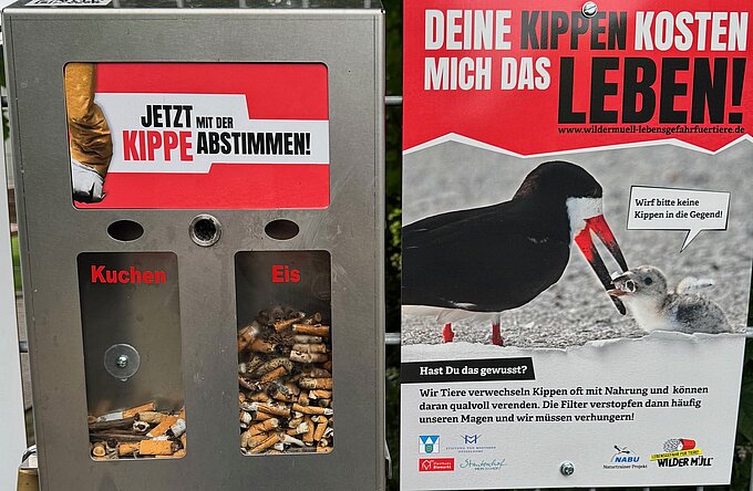 Und schon nach 10 Tagen ein voller Erfolg: Das Kippenbarometer gut gefüllt und der Platz frei von Kippen.