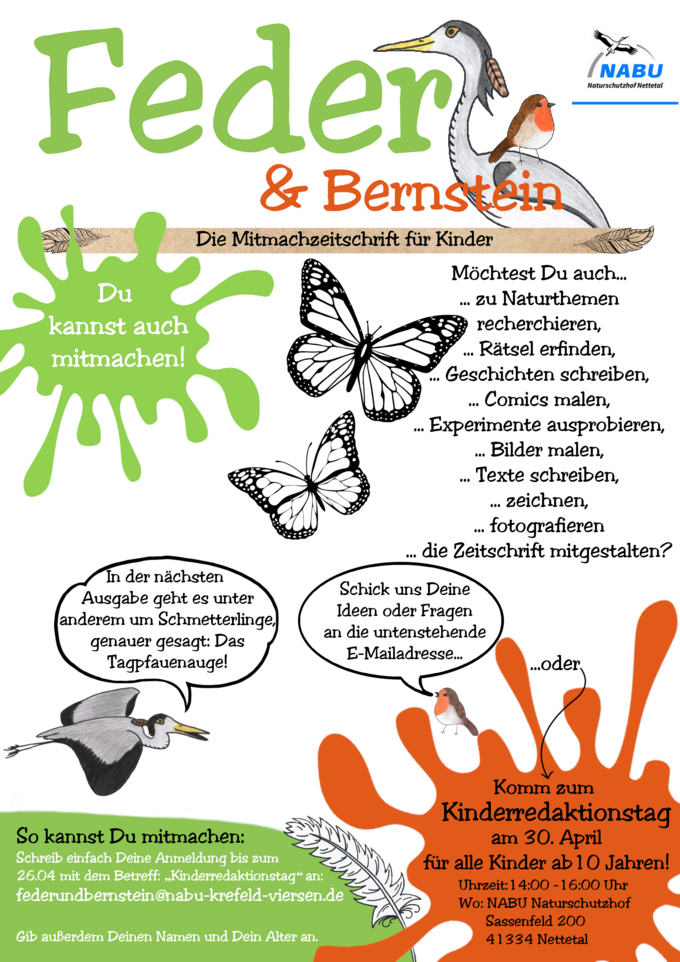 Du bist 10 Jahre alt oder älter und möchtest mal an einer Zeitschrift mitarbeiten? Das ist Deine Gelegenheit! Am 30.04. findet der erste Kinderredaktionstag für die Mitmach-Kinderzeitschrift "Feder & Bernstein" vom Naturschutzhof statt. Du kannst dabei mitmachen, egal, was Du am Liebsten tust: Ob du gern recherchierst, Texte schreibst, Rätsel erfindest, malst oder zeichnest, fotografierst oder Experimente ausprobieren möchtest... wir suchen Dich!