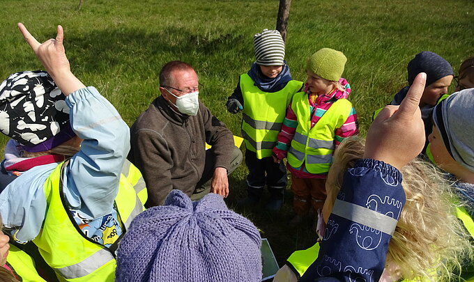 Schon oftmals führte ihr Spaziergang entlang unserer Streuobstwiese. Jetzt war es so weit, dass die kleinen Naturforscher in unserer Begleitung mehr über das Leben unter, auf und über der Streuobstwiese erfahren konnten.